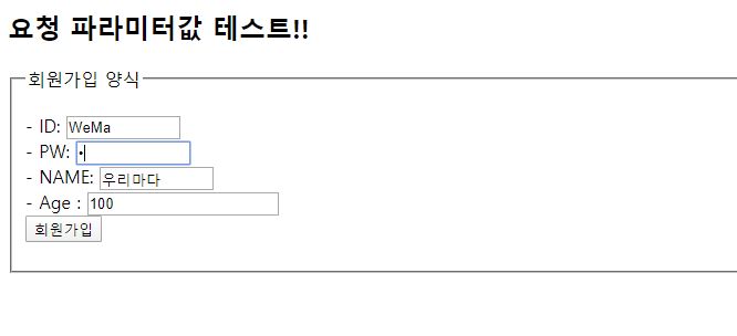 HttpServletRequest객체는 getParameter() 메서드를 사용해서 값을 받고 출력하지만