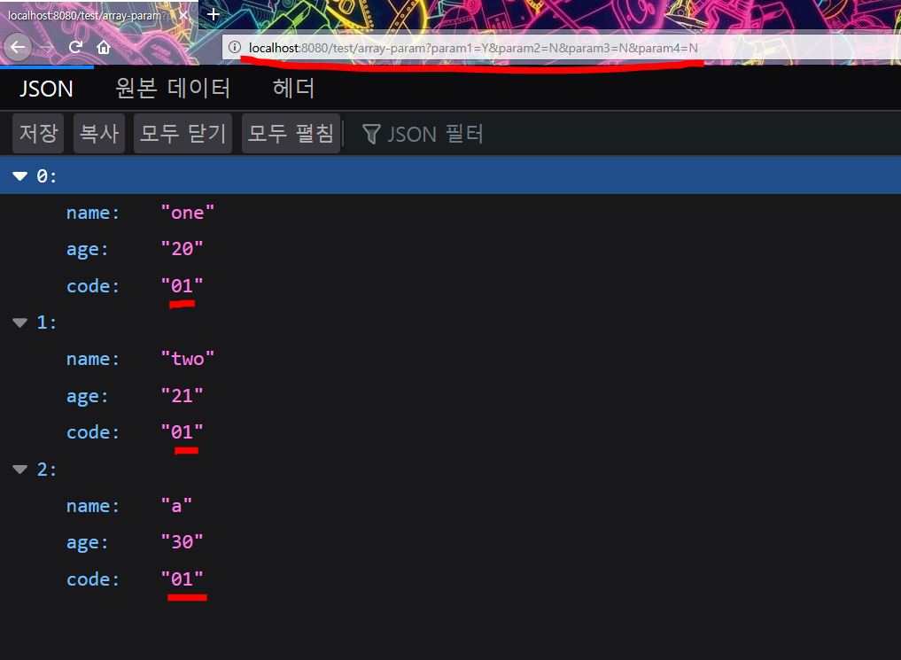 http://localhost:8080/test/array-param? param1=Y¶m2=N¶m3=N¶m4=N