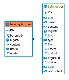댓글을 작성할 때 어느 게시글에서 등록된 댓글인지 알기 위해 게시글 테이블(training_bbs)에서의 PK(idx) 값을 댓글 테이블(training_bbs_cmt)에서 FK(bbscmtidx)로 사용하였습니다.
